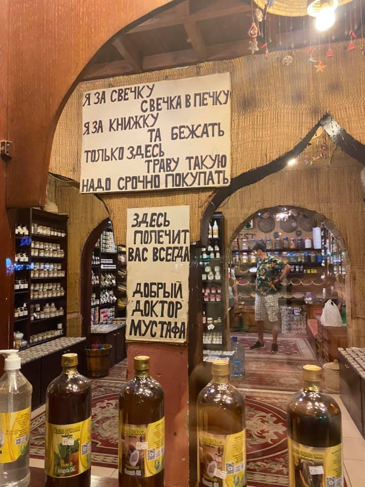 «Нет, ну я понимаю, что египтяне идут на любые ухищрения, чтобы заманить украинского туриста. Но почитайте эти „рекламные“ слоганы, сопровождающих копии укр торговых марок. Кто и в каком состоянии их составлял? Хотя последнее фото со стихотворением о траву все ставит на свои места!» — написала Романова.