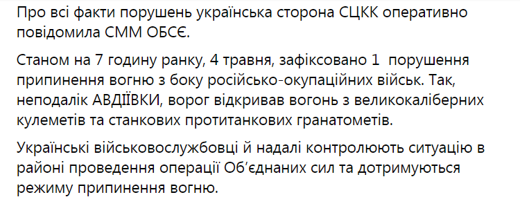 Что касается начала новых суток, 4 мая, то по состоянию на 7 утра на фронте было зафиксировано одно нарушение прекращения огня со стороны российско-оккупационных войск. Так, недалеко от Авдеевки враг открывал огонь из крупнокалиберных пулеметов и станковых противотанковых гранатометов.