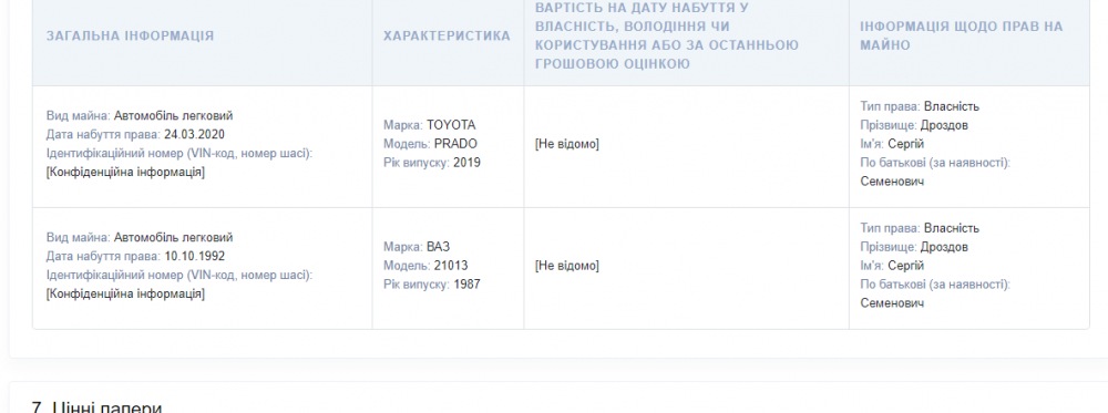 В налоговой отчетности генерал-лейтенант указал, что в марте 2020 года купил автомобиль Toyota Prado (2019). Стоимость машины офицер не задекларировал. Напротив, в сообщении об изменениях в имущественном состоянии Дроздов совершил два получил платежи от автосалона на 465,5 и 541,5 тыс. гривен в качестве дохода от отчуждения имущества. Таким образом, он получил более миллиона гривен.