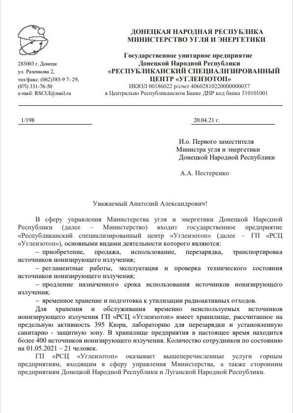 Итак, дано: предприятие, в хранилищах  которого хранятся источники ионизирующего излучения, фактически радиоактивные отходы, с предприятий: «Шахта им. Челюскинцев», «Шахта им. Е.Т. Абакумова», «Шахта им. А.А. Скочинского», шахта «Лидиевка», шахта Белореченская ГП «Луганскуголь», ЗАО «ГОФ «Луганская», шахта им. Баракова ОАО «Краснодонуголь» ГП «Луганскуголь», шахта Перевальская ГП «Луганскуголь», шахта Краснокутская, Донбассантрацит, шахта Мащинская ГП «Луганскуголь», СП «Шахта «Дуванная», шахта им. газеты «Известия» ГП «Донбассантрацит», Ш/у «Самсоновское-Западное» шахты «Ореховская».