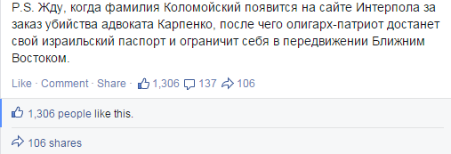 О том, что АП возлагает на это дело немалые надежды, свидетельствует, в том числе, недавний пост в Facebook депутата от Блока Порошенко Сергея Лещенко. "Жду, когда фамилия Коломойский появится на сайте Интерпола за заказ убийства адвоката Карпенко, после чего олигарх-патриот достанет свой израильский паспорт и ограничит себя в передвижении Ближним Востоком", - написал он.