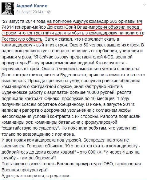 По всей видимости именно оттуда он и был отправлен в командировку в Украину, о чем свидетельствуют сообщения в соцсетях со страницы активиста Andrey Kalikh, в котором отмечается: "27 августа 2014 года на полигоне Ашулук командир 205 бригады в/ч 74814 генерал-майор Донских Юрий Владимирович объявил перед строем, что контрактники должны убыть в командировку на полигон в Ростовскую область. Затем сказал, кто не желает ехать в командировку – выйти из строя. Около 50 человек вышло из строя. В адрес вышедших из уст генерала полились оскорбления, унижения и прямая угроза: "Я сейчас вызову представителей ФСБ, военной прокуратуры!"