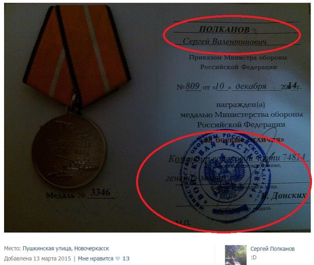Ну и как же без поощрения сержанта Полканова за участие в боевых действиях против Украины? Так в декабре 2014г. ему выдана медаль министрества обороны РФ "За боевые отличия" за подписью того самого генерал-майора Донских, который в принудительном порядке отправлял военнослужащих в командировку.