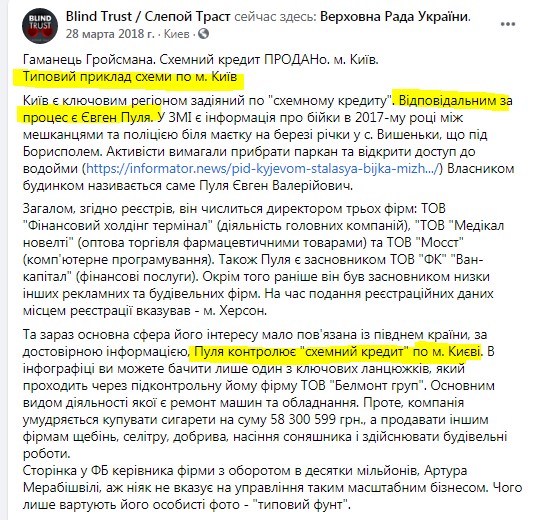 Ось ще приклад. На сторінці «Сліпий траст» у соцмережі Фейсбук був розміщений розгромний матеріал з приводу «діяльності» того самого Пулі – "смотрящего" товариша Гройсмана, а також відповідального за всі ці схеми. У ньому показали лише одну з конкретних схем заробітку, але наочно. І це тільки один приклад…