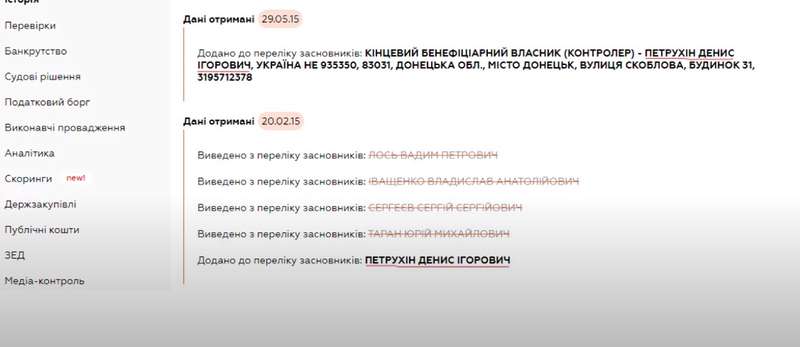 Прекрасная возможность для всех желающих проверить подлинность «пленок Медведчука», пользуясь доступными данными госреестров. В 2015 году основателем киевского ТОВ «Нові проекти» и ее клона в российской юрисдикции была ООО «Фо Сизонс Трейд», оформленная, как и говорил голос Медведчука, на жителя Донецка Дениса Петрухина.