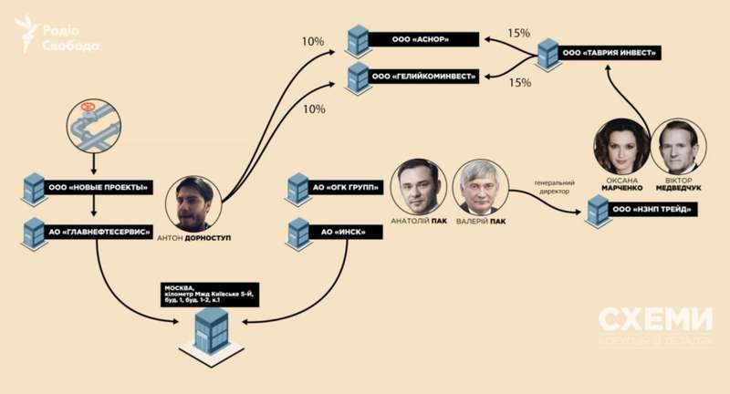 Цугом в учредители «Новых проектов» заходит месяцем ранее, в апреле 2016 года, созданное АО «Главнефтесервис», где учредителем (не путать с акционером!) записан Антон Дорноступ, связанный с нефтяным бизнесом Оксаны Марченко в России. Вся схема их связей — у проекта Схемы, которые расследовали российскую нефтянку Медведчука-Марченко.