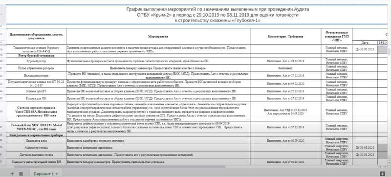 Во-первых, в открытом доступе мы нашли График выполнения мероприятий по замечаниям аудита СПБУ, который проводился в конце 2019 года «для оценки готовности к строительству скважины «Глубокая-1». Ремонты и замены оборудования буровой установки должны были закончить до 30 марта 2021 года.