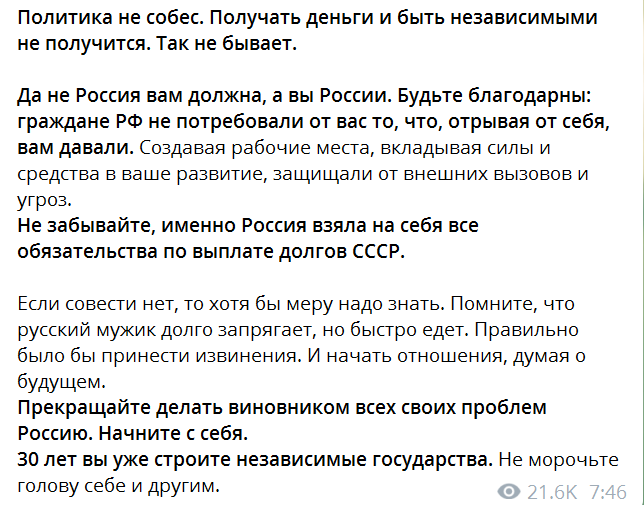 "Если совести нет, то хотя бы меру надо знать. Помните, что русский мужик долго запрягает, но быстро едет. Правильно было бы принести извинения. И начать отношения, думая о будущем. Прекращайте делать виновником всех своих проблем Россию. Начните с себя. 30 лет вы уже строите независимые государства. Не морочьте голову себе и другим", – угрожающе подытожил он.