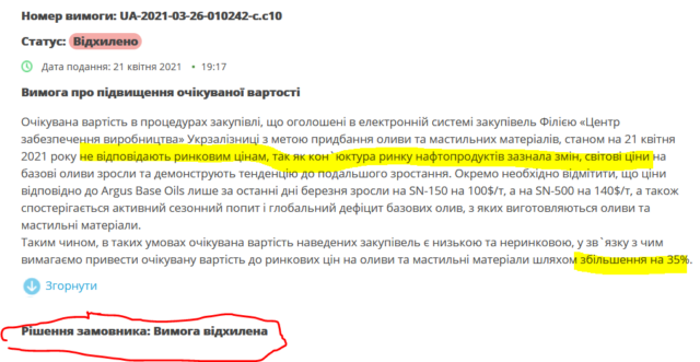 «…очікувана вартість наведених закупівель є низькою та неринковою, у зв`язку з чим вимагаємо привести очікувану вартість до ринкових цін на оливи та мастильні матеріали шляхом збільшення на 35%».