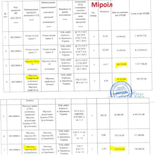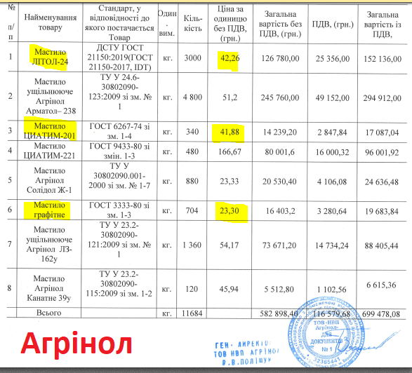 Отже стартова сумарна пропозиція «Міроіла» по семи видам мастил виробництва «НВП «Агрінол» – 21,97 млн грн, це майже точно дорівнює очікуваній ціні тендеру 22,02 млн грн. Тобто заявлені «Міроілом» ціни за окремі мастила у сумі відповідали очікуванням залізничникам. Однак ці ціни на фоні інших закупівель просто скажені.