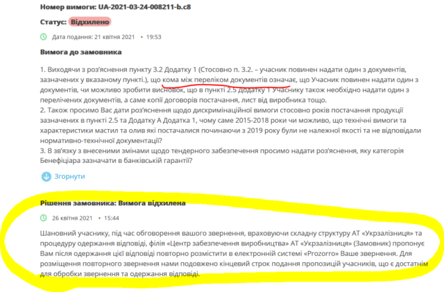 Залізниця у відповідь нібито виявила непохитність. Вимогу відхилили та очікувана вартість тендерів не змінилась, як було у сумі 210 млн грн – так і лишилось.