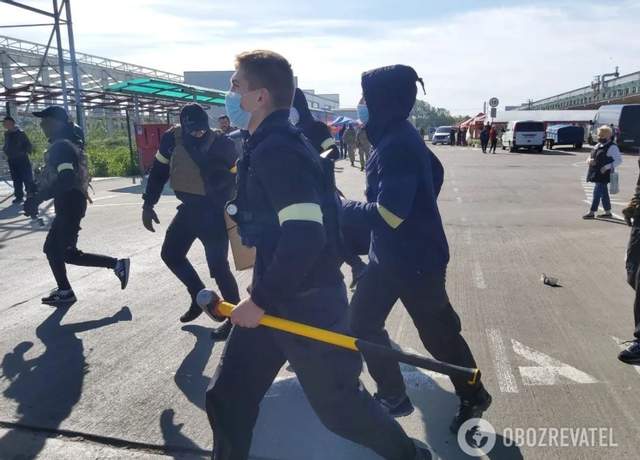 На вызов оперативно прибыли киевские правоохранители. В сопровождении Нацгвардии они задержали 4 титушок, которые сторожили проходную на территорию рынка и не давали заехать автобусам. В отношении их применили слезоточивый газ.