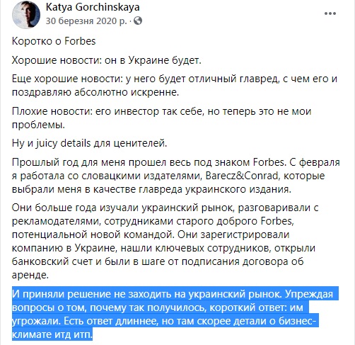 Ответ на вопрос, почему Barecz & Conrad Media отказались от издания журнала в Украине, дала на своей странице в Facebook Катерина Горчинская, которая должна была стать главредом журнала: «Упреждая вопросы о том, почему так получилось, короткий ответ: им угрожали. Есть ответ длиннее, но там скорее детали о бизнес-климате итд итп».