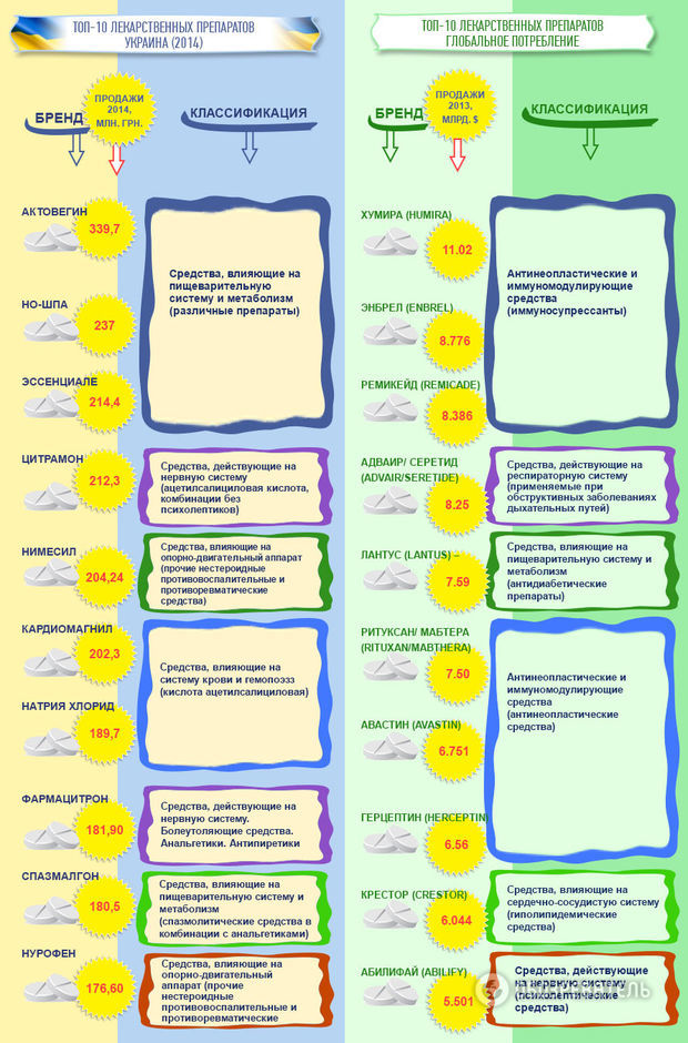 Любопытный момент: почти десятая часть всего объема фармацевтического рынка приходится (по данным все той же IMS Health Consulting за 2013 год) на 10 самых популярных препаратов, которых в мире было продано на 76,5 млрд долл. (7,9%).
