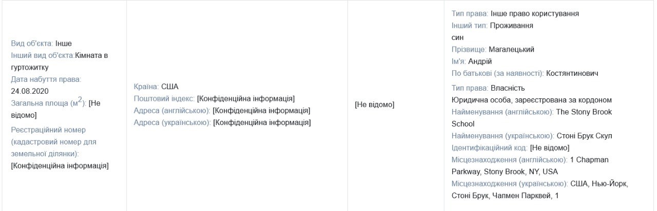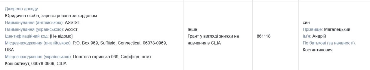 Теперь обо всем по порядку. Давайте рассмотрим декларацию Владиславы Валерьевны за 2020 год. Не будем акцентировать внимание на автомобилях премиум класса, которые госпожа Магалецкая покупает по цене в несколько раз ниже рыночной стоимости, пусть этим занимается НАЗК, посмотрим на раздел “Доходы, в том числе подарки” где указан “Грант в виде скидки на обучение в США” в размере 861 тысяча 118 гривен на имя сына Владиславы Валерьевны Андрея Магалецкого. Грант выдан юридическим лицом с иностранной регистрацией ASSIST – неприбыльной организацией с центральным офисом в США. Благодаря щедрости ASSIST Андрей Магалецкий начал обучение в The Stony Brook School, в городе Стоуни-Брук на Лонг Айленде, в 80 км от Нью-Йорка. The Stony Brook School — частная школа-пансион для девочек и мальчиков от 13 до 18 лет. Стоимость обучения в этой школе стартует от 63 200$ в год. Указанная в декларации сумма в размере 861 тысяча 118 грн. составляет приблизительно 50% от стоимости обучения в год. Мы ничуть не удивимся, если в следующем году Андрей Магалецкий снова получит грант на обучение.