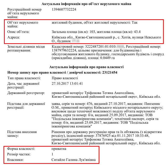 Но и это не самая дорогая недвижимость. Судейская семья пользуется симпатичным домом в Хотове под Киевом. Это собственность матери Галины Ситайло. Из деклараций следует, что им пользуется именно судья с 2013 года. Интересно, что площадь дома 290 кв. м, но в 2017 году произошло разделение и судья декларирует уже пользование только 187 кв. м.