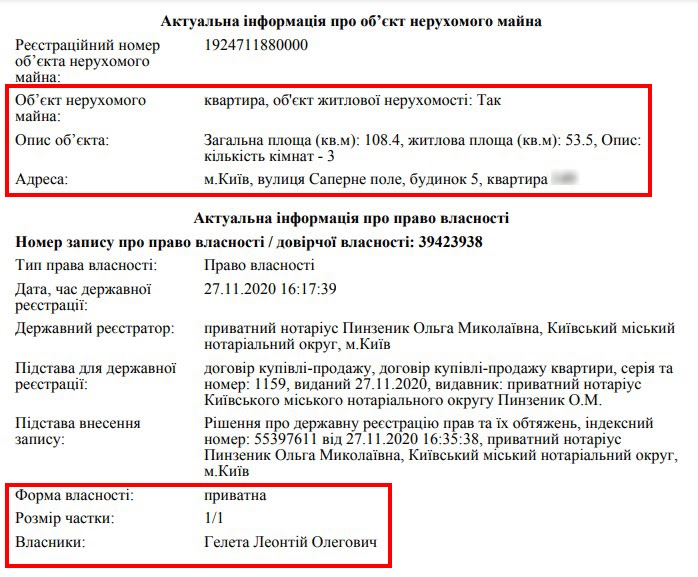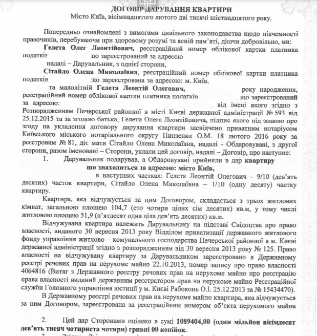 С 2013 года она проживала в столичной квартире площадью 104 кв. м. Из договора в ее судейском досье следует, что она расположена в новостройке в Лабораторном переулке, д. 6. Квартира была приватизирована бывшим мужем судьи Гелетей уже после развода в сентябре 2013 года. В феврале 2016 года он подарил ее сыну и судье. Интересно, что, согласно договору, рыночная стоимость квартиры составляла 1,08 млн грн. Именно эту квартиру судья продала в 2020 году за 3,61 млн грн. То есть получается, что за 4 года ее цена выросла более чем 3 раза. Но и эта цена на вид сомнительна, поскольку, согласно данным специализированных сайтов, рыночная цена квартир такой площади в этом доме стартует от 190 тыс. долларов, то есть от 5,1 млн гривен. Кстати, именно в этом доме имел на 40 кв. м большую квартиру и известный судья Евгений Аблов. В 2016 году он ее продал за 9,1 млн грн.