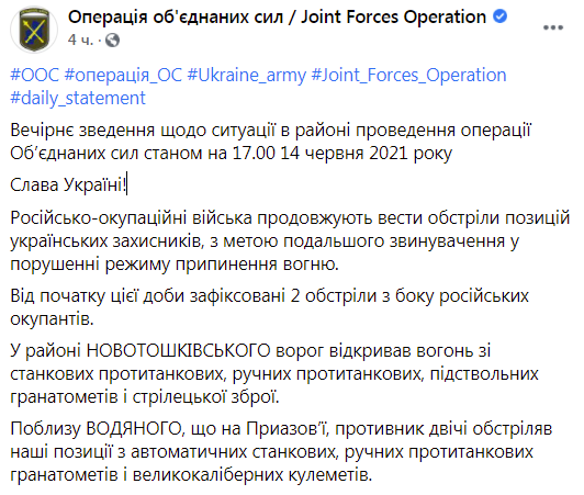 Добавим: в ООС по состоянию на 17:00 14 июня сообщали о двух нарушениях режима прекращения огня со стороны противника.