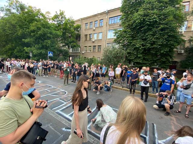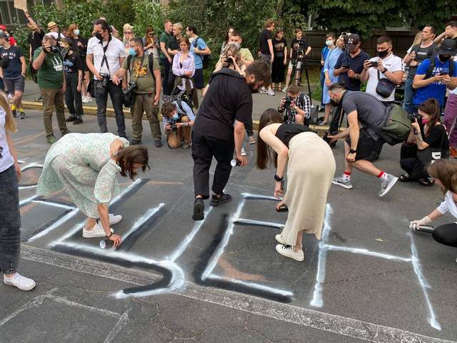 На демонстрацию пришло около сотни человек. Они рисовали на асфальте фамилии Авакова, Геращенко и тому подобное.