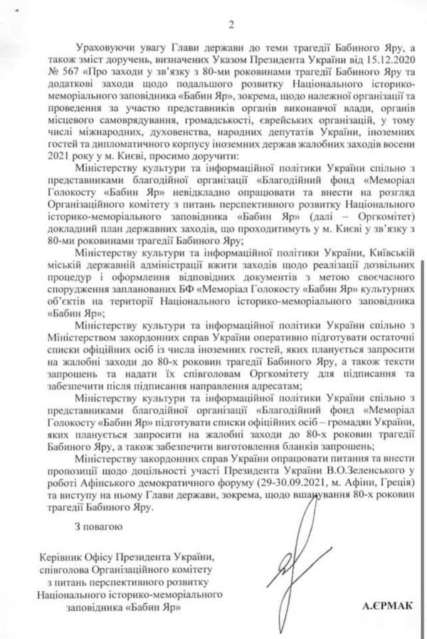 Глава Офісу президента Андрій Єрмак доручив Київській міській державній адміністрації (і іншим) вжити заходів для прискорення реалізації БФ "Меморіал Голокосту "Бабин Яр"", що є прямим тиском на КМДА та міськраду.