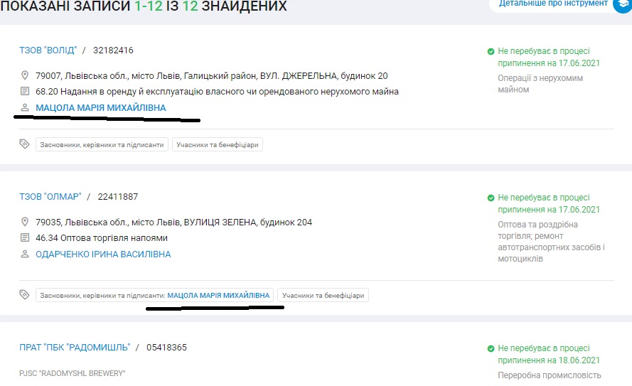 То вона бізнесвумен: у той момент, коли Марія Мацола керувала, судячи з даних реєстрів, цією сільською амбулаторією, вона в той же час займалася бізнесом, до того ж досить успішно. Тим чи іншим способом вона значиться причетною щонайменше до 12 бізнес структур: