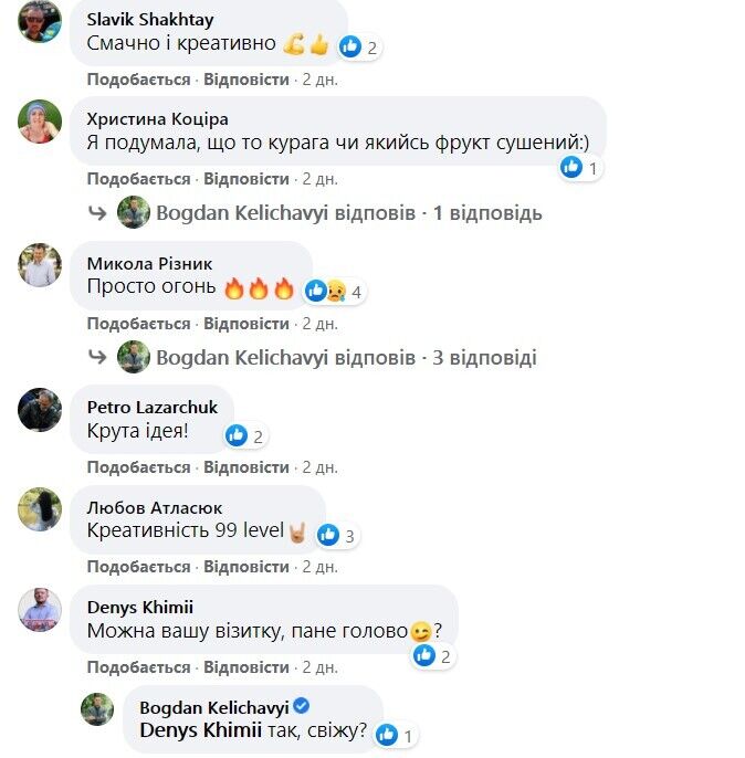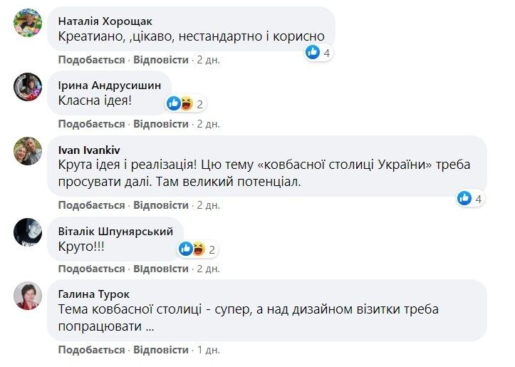 "Вкусно и креативно", "Я подумала, что это курага или какой-то фрукт сушеный", "Крутая идея!", "Можно вашу визитку, господин глава?", "Тема колбасной столицы – супер, а над дизайном визитки надо поработать", "Креативно, интересно, нестандартно и полезно", – прокомментировали пользователи сети визитку Келичавого.