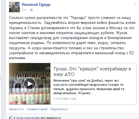 Неделей раньше тот же Цукур обвинил начальника Главного управления МВД Украины в Луганской области Анатолия Науменко в крышевании бизнеса боевиков. После чего генерал милиции заявил, что грузовые составы из "ЛНР" - фантазия, с помощью которой "Торнадо" пытается отвлечь внимание от собственных преступлений.