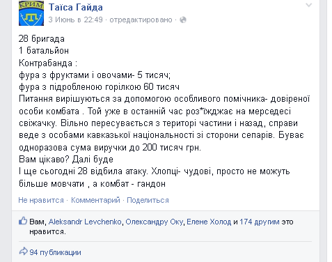 В соцсетях хватает и других шокирующих сообщений о бизнесе украинских военачальников, которые по-дружески ведут дела с террористами. В данном случае - об этом пишет волонтер Таиса Гайда.