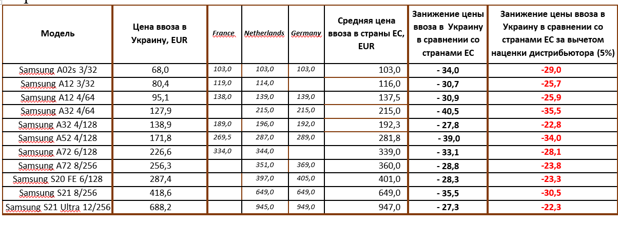 Нами также проведен анализ цен смартфонов Samsung на европейском рынке (таблица ниже). Выведем среднюю цену на определенную модель смартфона Samsung на рынках Германии, Нидерландов, Франции, вычтем из нее максимальную наценку дистрибьютора – 5%. Цена ввоза товаров на территорию Украины в сравнении со средней рыночной ценой стран Евросоюза за вычетом наценки дистрибьютора занижена в диапазоне от 22 до 35 процентов в зависимости от модели смартфона Samsung. Указанная разница в цене одного и того же товара свидетельствует об искусственном занижении его стоимости для ухода от налогообложения на территории Украины.