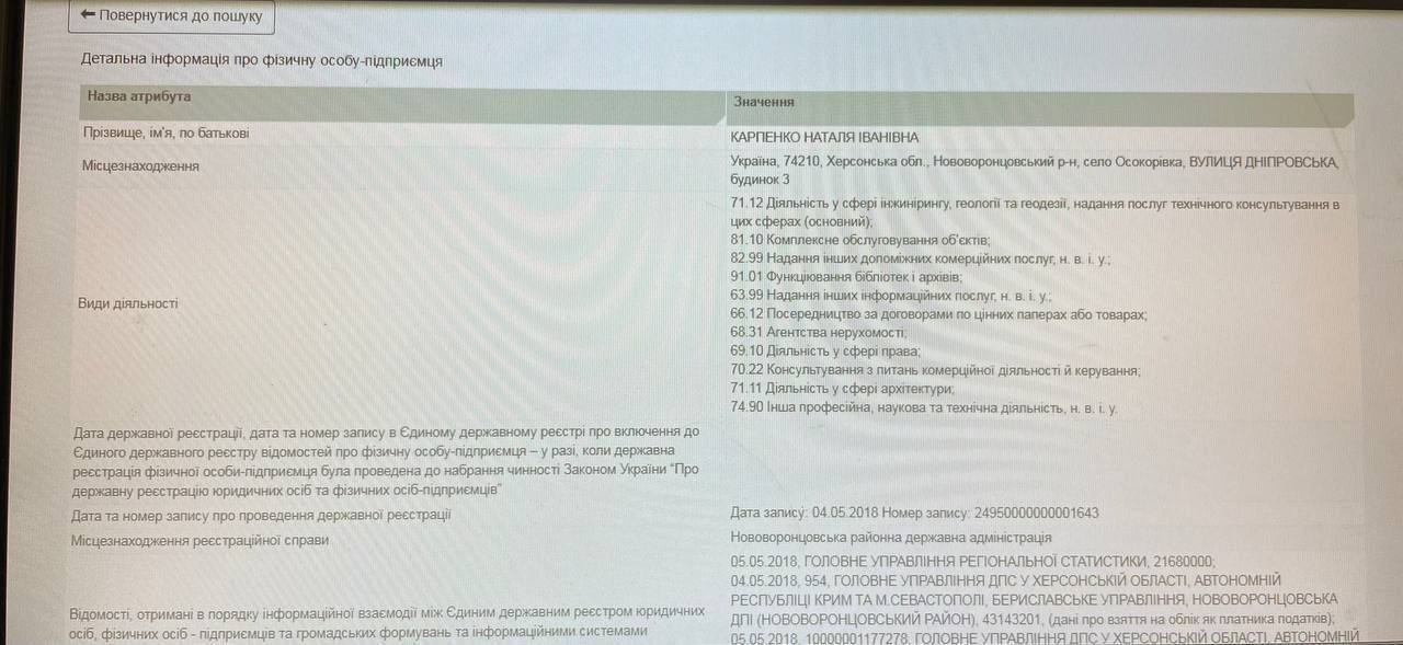 Шапран затягнув Карпенка в цю тему ще за часів свого правління на землях Херсонщини. Ба більше, з його легкої подачі Олександр Карпенко встиг побувати очільником Херсонської регіональної філії Державного підприємства «Центр Державного земельного кадастру». До цього – засвітитися у списку кандидатів у депутати Красноперекопської міської ради Республіки Крим першого скликання, висунутого Кримським регіональним відділенням Політичної партії ЛДПР – Ліберально-демократичної партії Росії по єдиному виборчому округу під № 4. Ну і вишенька на торті – свого часу ФОП Карпенко Н. І. була зареєстрована в окупованому Криму, вид діяльності 52.62.0 – роздрібна торгівля з лотків та на ринках. Однак час іде і треба йти з ним в ногу, тому перекваліфікація не забарилася і тепер ФОП Карпенко Н. І. спеціалізується на діяльності у сфері інжинірингу, геології та геодезії, наданні послуг технічного консультування в цих сферах. З огляду на усе вищезгадане, здається, що тут вже варто було б і зупинитися, утім такий кінець можливий для пересічного громадянина, але аж ніяк не для безпринципного і ласого до дерибану Шапрана.