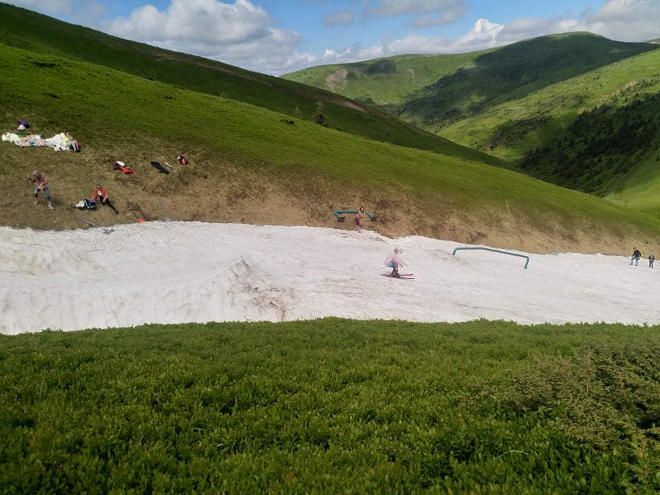 Покататься на лыжах в конце июня можно на Свидовце, курорт Драгобрат за перемычкой у верхней станции Карпатской Чайки.