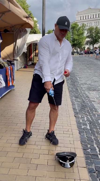 Далее он бросил фуражку на тротуар, полил какой-то жидкостью из бутылки и прямо там поджег, правда – не с первого раза.