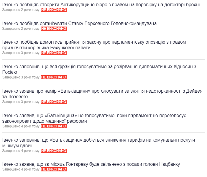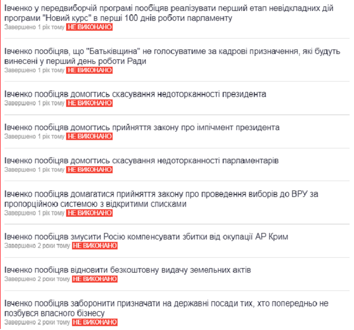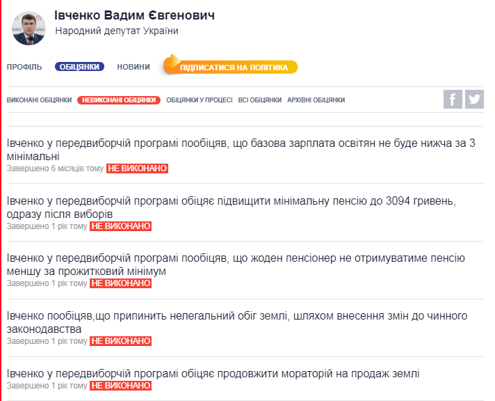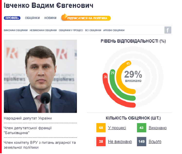 Согласно данным информационного ресурса «Слово и дело», нардеп выполнил лишь 29 % из обещанного. То есть из 149 обещаний исполнено 43. За все время.