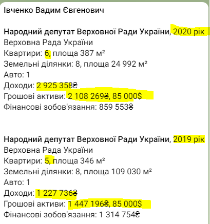 Доходы нардепа за 2020-й по сравнению с 2019-м годов выросли более чем в два раза. Если в 2019 сумма доходов Ивченко составляла свыше 1,23 миллиона гривен, то уже в 2020-м доходы, которые задекларировал депутат, составили почти 3 миллиона. Нормально так депутат поработал… И, заметим, это только официальная цифра…