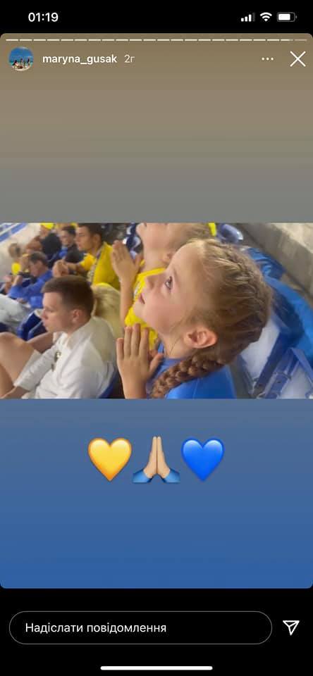 На одном из снимков видно, как девочки сложили руки для молитвы и смотрят в небо, а на другом — как поют с болельщиками гимн Украины, положив правую руку на сердце.