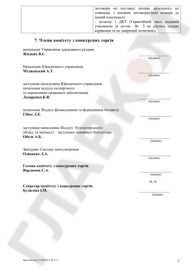 2 апреля 2015 года Комитет по конкурсным торгам Государственного агентства резерва Украины опубликовал протокол раскрытия предложений на конкурсных торгах по закупке горюче-смазочных материалов в количестве 5 лотов по 3 600 тонн. О проведении по закупке торгов было объявлено еще 31 декабря 2014 года.