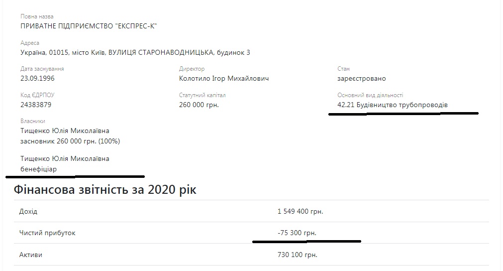 Вона купила цю землю і розпочала грандіозне будівництво в лісі в минулому, 2020 році. Очевидно, її матеріальне становище різко покращилося. Звідки гроші – довго гадати не доводиться. ПП «Експрес-К» Юлії Тищенко виграло тендер на 16 мільйонів гривень на частину робіт з будівництва Подільсько-Воскресенського мостового переходу.