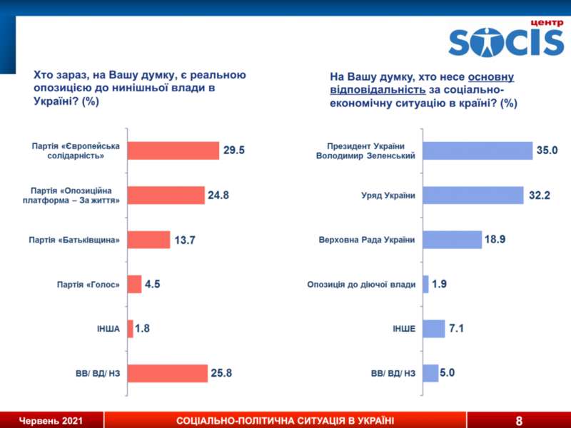 А реальной оппозицией ко власти 29,5% считают “Евросолидарность”, 24,8% – “ОПЗЖ”, 13,7% – “Батькивщину”, 25,8% не определились или отказались отвечать.