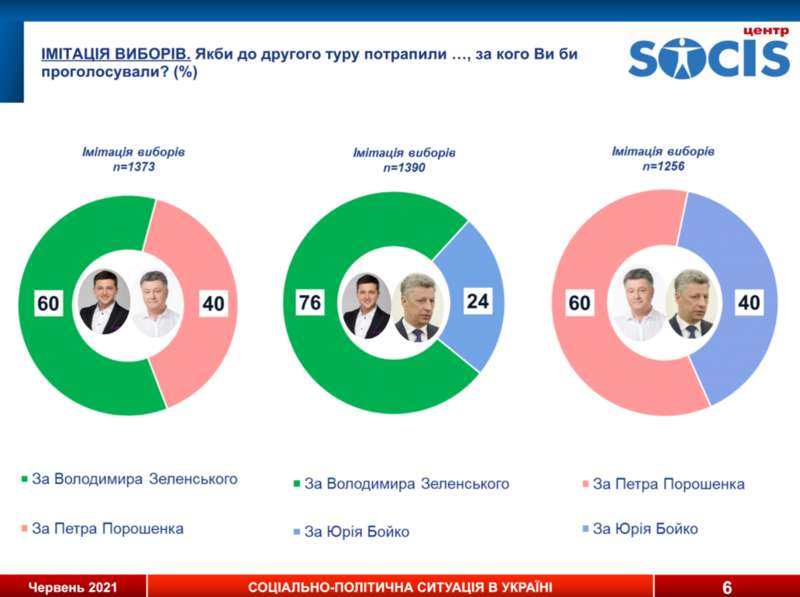 Во второй тур вероятнее всего попали бы Владимир Зеленский, Петр Порошенко и Юрий Бойко. В паре Зеленский-Порошенко 41,6% (60% среди тех, кто голосовал бы и определился) за Зеленского, 27,1% (40%) – за Порошенко.