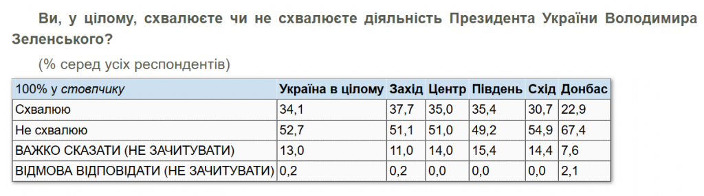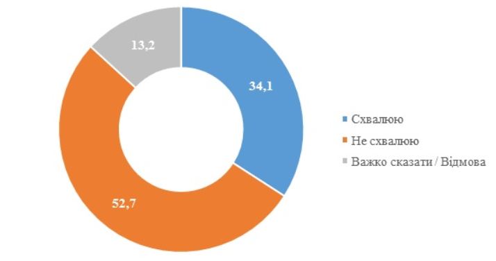 52,7% не одобряют деятельность президента Владимира Зеленского, одобряют – 34,1%, считают опрошенные КМИСа. По мнению респондентов СОЦИС, именно Зеленского (35%) наряду с правительством (32,2%) считают ответственным за социально-экономическую ситуацию в стране. Еще 18,9% винят ВР.