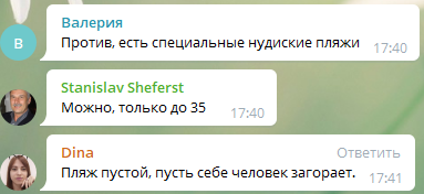 "Я лично против. Для этого есть специальные места", "Ну грудью меня не удивишь, а вот мужика нудиста я бы не хотела увидеть там", "Против, есть специальные нудистские пляжи", "Можно, только до 35", "Пляж пустой, пусть себе человек загорает", – пишут люди.