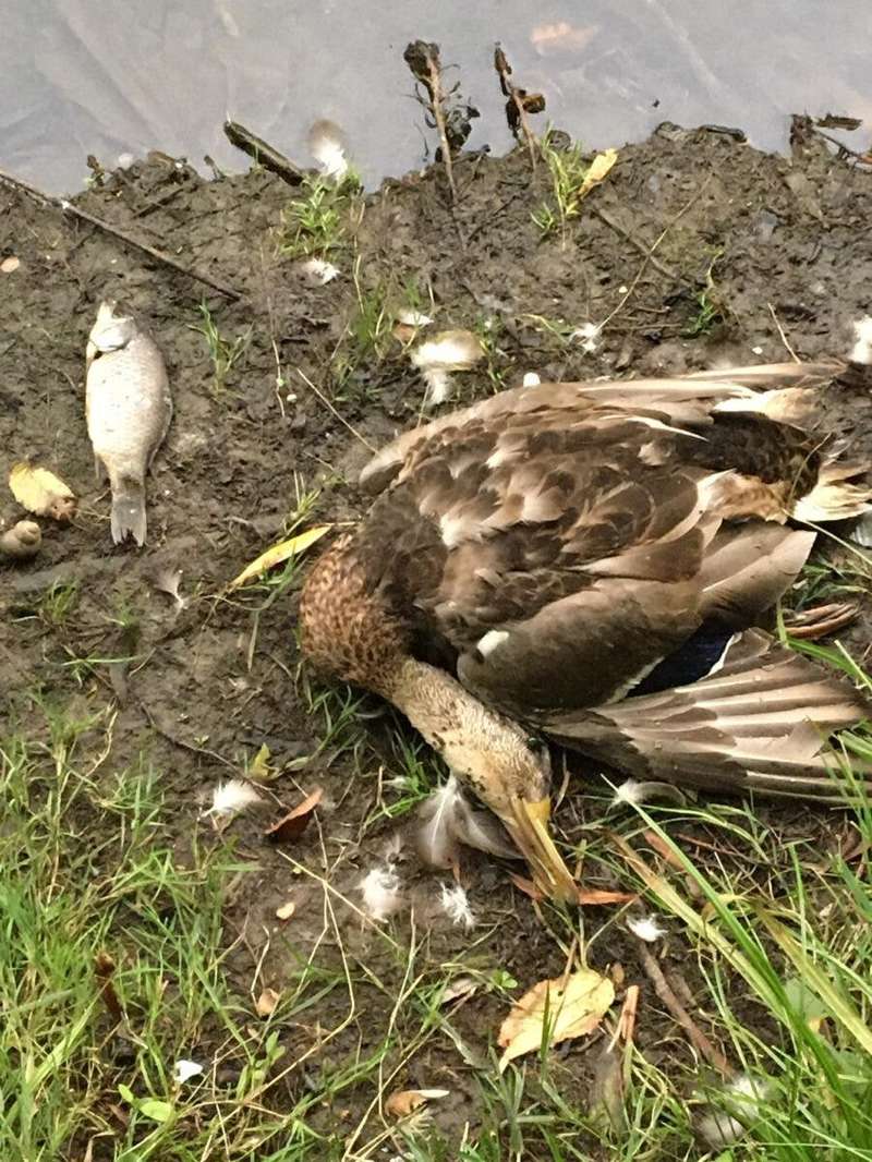 Пользовательница соцсети Татьяна Войнаровская опубликовала фото мертвой рыбы и уток на берегу пруда возле детской площадки. По ее словам, мертвая рыба и птицы лежали вдоль всех берегов пруда, пока их не убрали. Но неприятный запах остался.