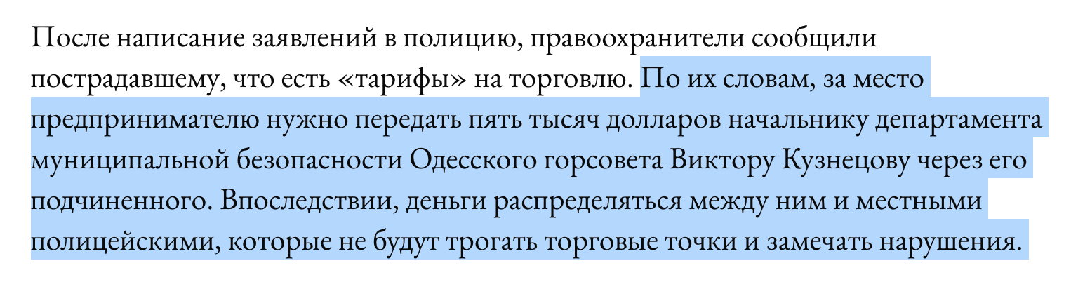 В общей сложности, только за один месяц, чиновник собирает «черного нала» на сумму более 200$ тыс. Не в этом ли кроется его секрет столь долгого прибывания на своем посту? Несмотря на многочисленные обвинения в коррупции и наличия нескольких открытых уголовных дел в ГБР и Прокуратуре, Кузнецов уже 4 года является бессменным руководителям одесской «муниципальной стражи».