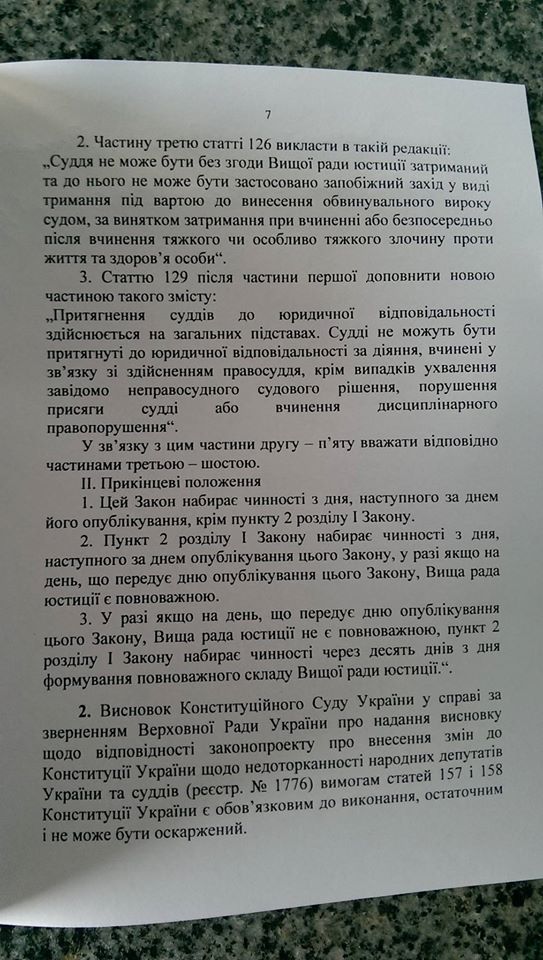 "Признать отвечающим требованиям статей 157 и 158 Конституции Украины законопроект о внесении изменений в Конституцию Украины относительно неприкосновенности народных депутатов Украины и судей", - говорится в сообщении.