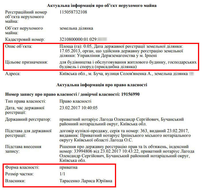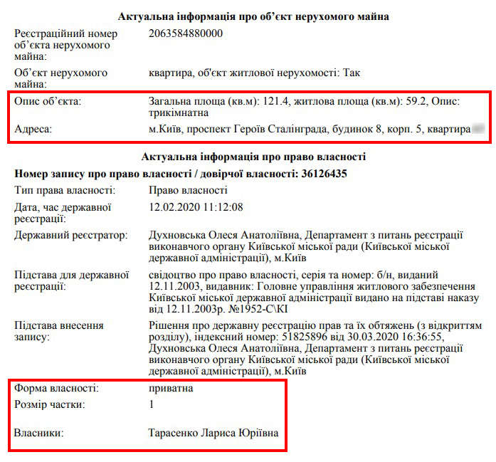 Без бізнесу, але з коштовним майном і мама судді Лариса Тарасенко. У 2003 році вона отримала свідоцтво про право власності на велику квартиру площею 120 квадратних метрів в елітному житловому комплексі, що по столичній вулиці Героїв Сталінграда. Правда, зареєструвала в реєстрі цю квартиру вона лише у 2020 році.