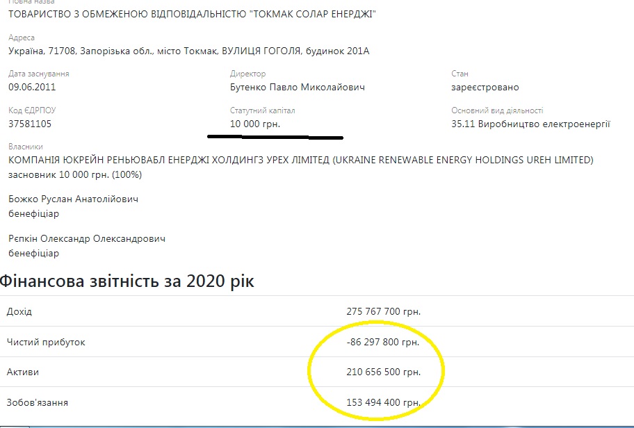 В рамках уголовного дела № 52017000000000617 подсчитаны убытки за 2018 год – 300 миллионов гривен. Сколько это будет до 2030-го – неизвестно. Впрочем, до 2030 года доить государство вряд ли удастся – в рамках другого, уже хозяйственного дела, Верховный суд Украины отменил коэффициент 4,8 для фирмы Репкина и Божко. Так что доили они страну лишь семь лет. Вот только вопрос – сумеет ли теперь государство вернуть свои деньги? Если принять убытки за 2018 год за среднюю цифру, та за период с 2013 по 2019 годы (это минимум) поучается – 300 миллионов на 7 лет – 2 миллиарда 100 миллионов гривен. А если посмотреть на результаты деятельности ООО «Токмак солар энержди» за прошлый, 2020 год, то они отнюдь не впечатляют: