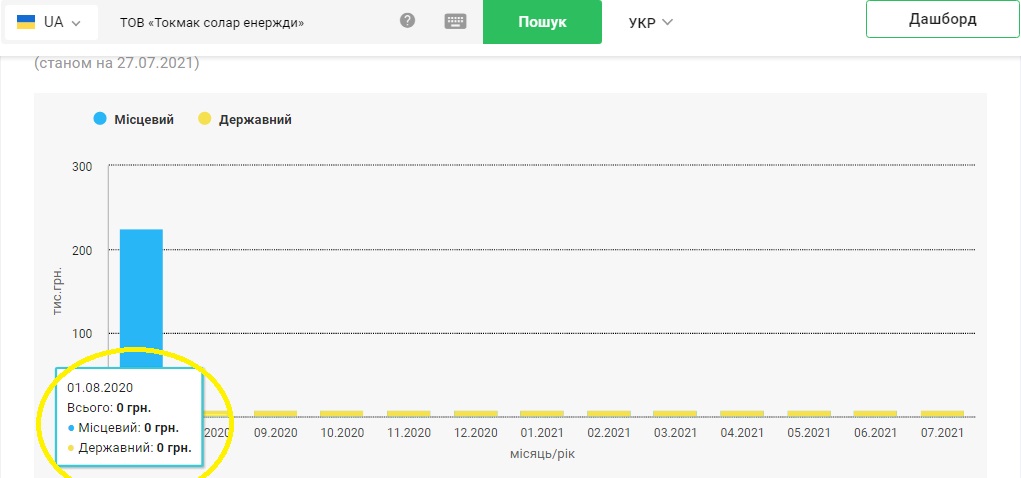 Кстати, ООО «Токмак солар энержди» уже год как прекратило платить налоги: если 01.07.2020 года было уплачено 222 492 гривны, то уже 01.08.2020 года этот показатель равнялся нулю. Что весьма симптоматично:
