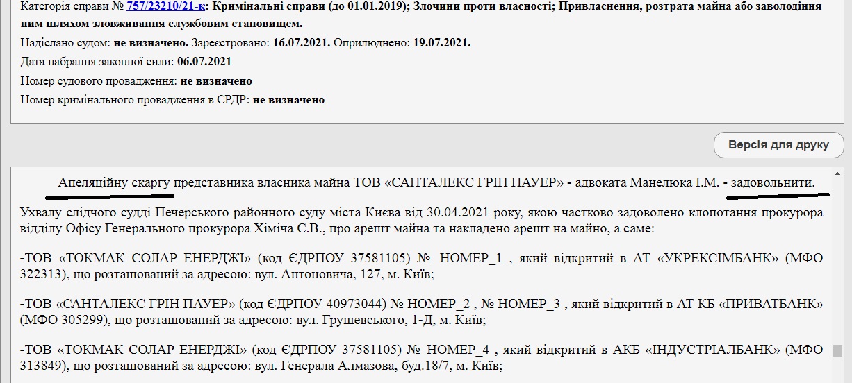 Данные в судебном реестре относительно расследования упомянутого уголовного дела № 52017000000000617 насчитывают 11 решений за период с 12 декабря 2018 года по 6 июля 2021-го. Это означает, что дело не ведется никак. А последние решения в реестре – это разнообразные жалобы процессуального характера, которые лишь подтверждают тот факт, что дело разваливается. К тому же последним решением суд удовлетворил жалобу адвокатов подозреваемых и разблокировал их имущество, в том числе и имущество ООО «Токмак солар энержди»: