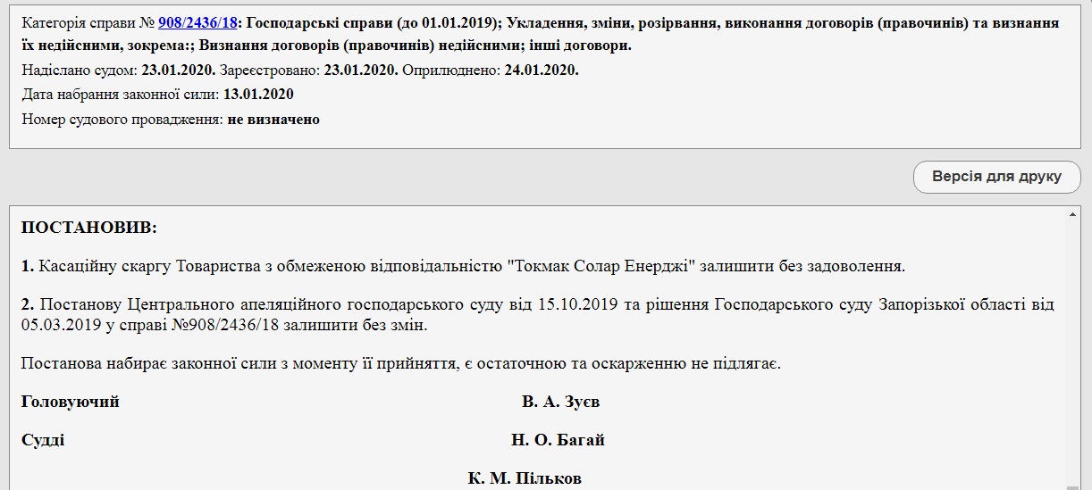 Единственный позитив – решение Кассационного хозяйственного Верховного Суда от 13 января 2020 года (это решение принималось в рамках расследования уголовного дела, так что непосредственно имеет отношение к нему, хотя в данном случае и шла речь о хозяйственном споре). Этим решением Суд отказал ООО «Токмак солар энержди» в жалобе на решение Хозяйственного суда Запорожской области, которым признавалось незаконным применение для «Токмака» коэффициента 4,8 при покупке у последнего электроэнергии государством: