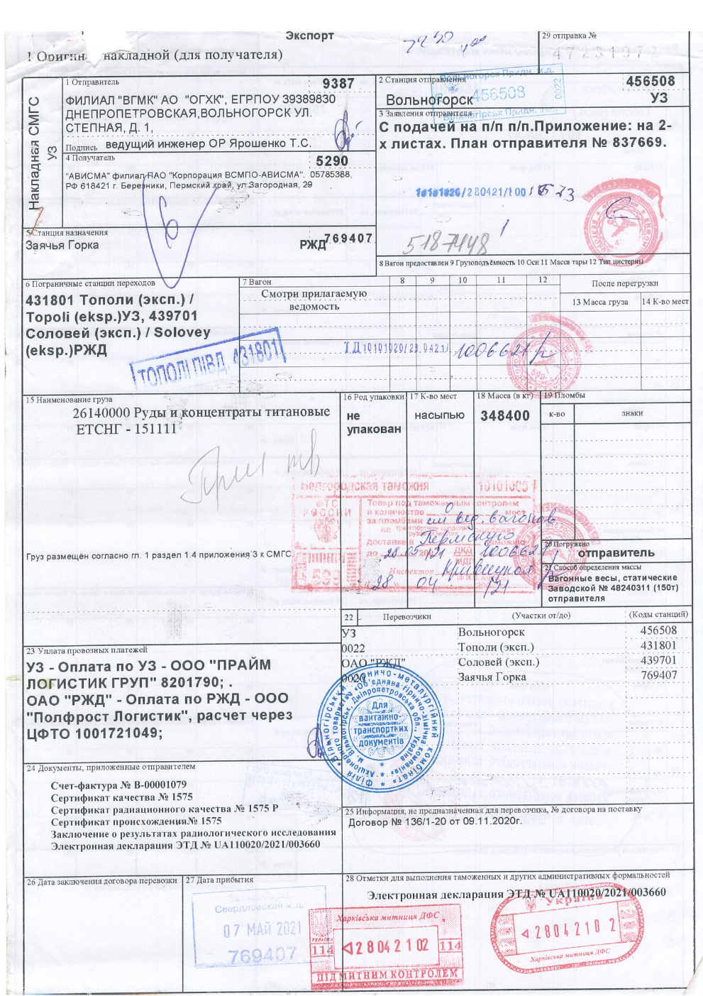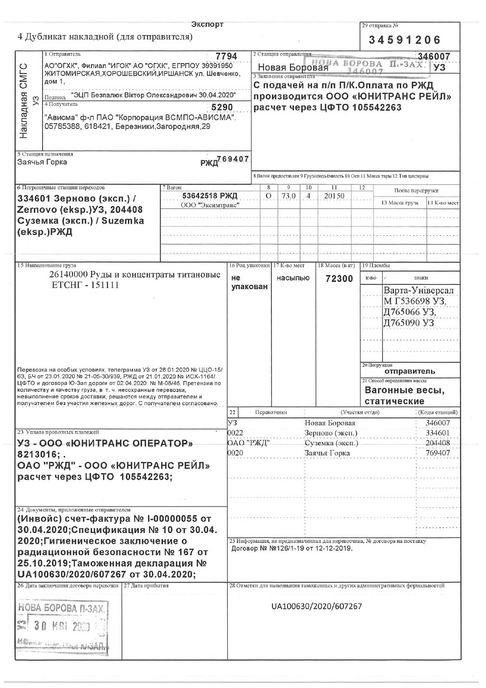 В частности, 30 апреля 2020 года ОГХК отгрузила 72,3 тонны ильменитового концентрата (насыпью) через филиал «Иршанский ГОК» в Россию по адресу филиала «Ависма» АО «ВСМПО-АВИСМА» со станции «Нова Борова» на станцию «Заячья Горка» (документ см. ниже или по ссылке). Поставки осуществлялись согласно контракту №126-1/19 от 12.12.2019 г.